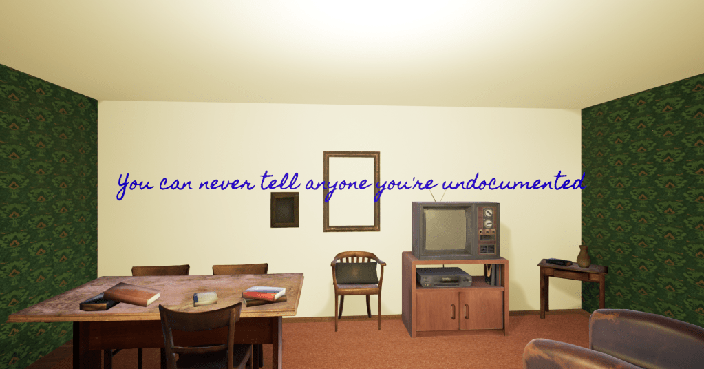 The second format, subtitled “Dynamic 3D,” positions the player along the “fourth wall” of a simple apartment scene. As the player rotates their view around the space, the same 3D text quotations taken directly from the audio appear wherever the player is looking.