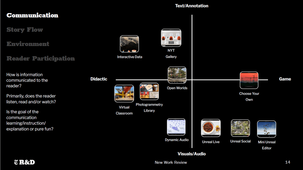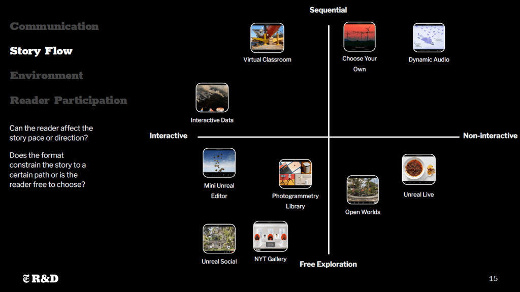 Those defined storytelling formats were then analyzed according to four categories of user experience to determine what kinds of Times content they would best suit. These categories included: Communication, Story Flow, Environment, and Reader Participation. The product of this outcome was the following four graphs, where each format was plotted accordingly.